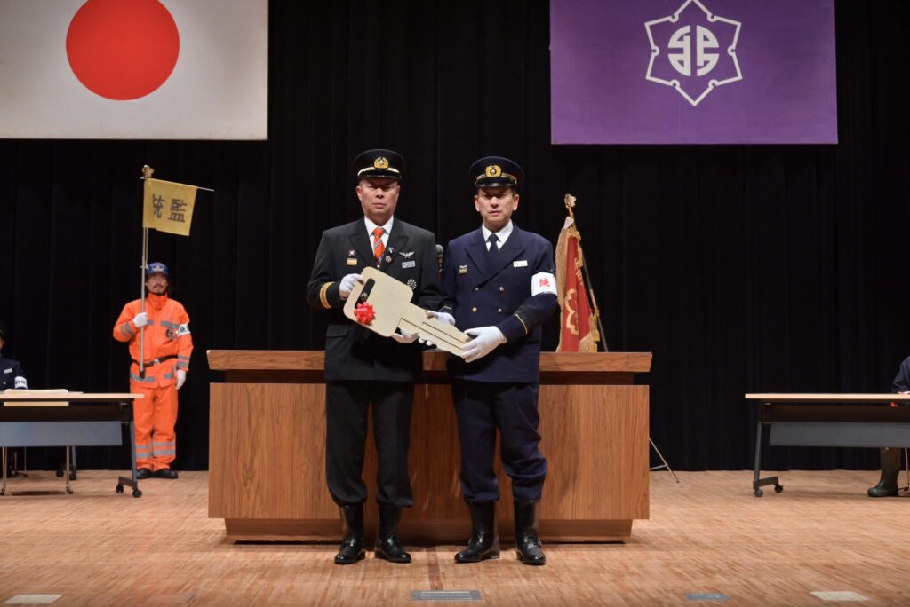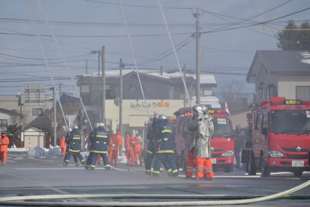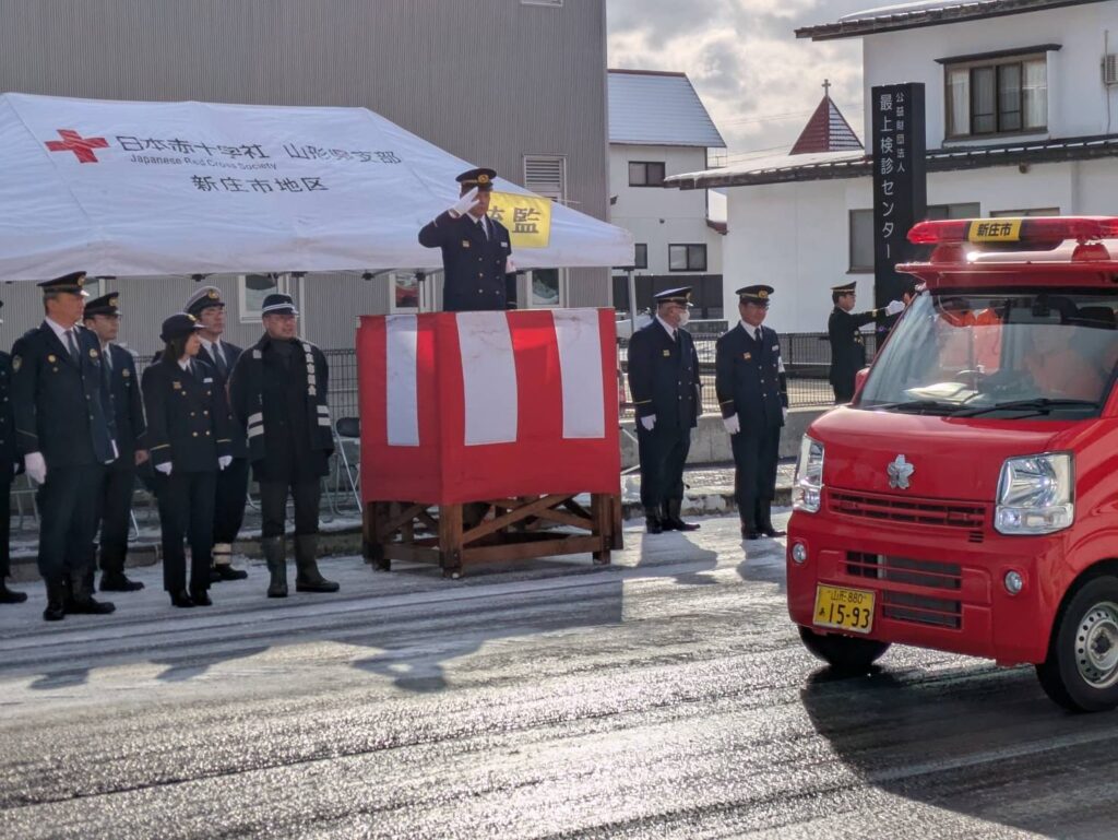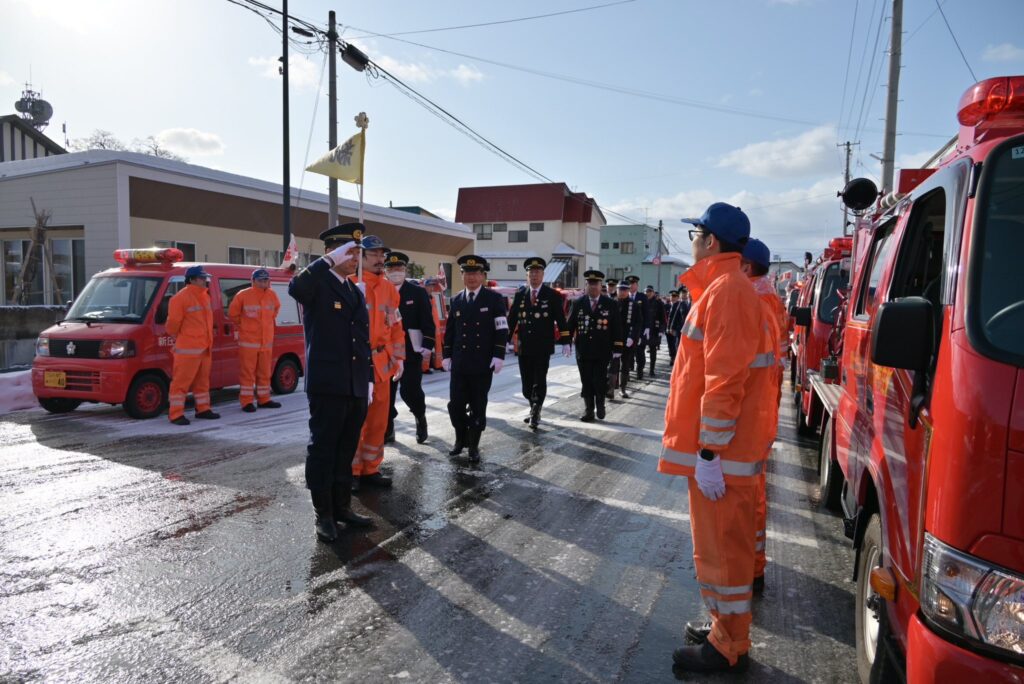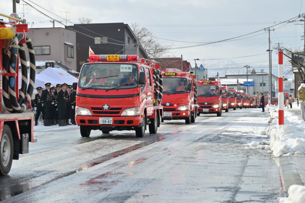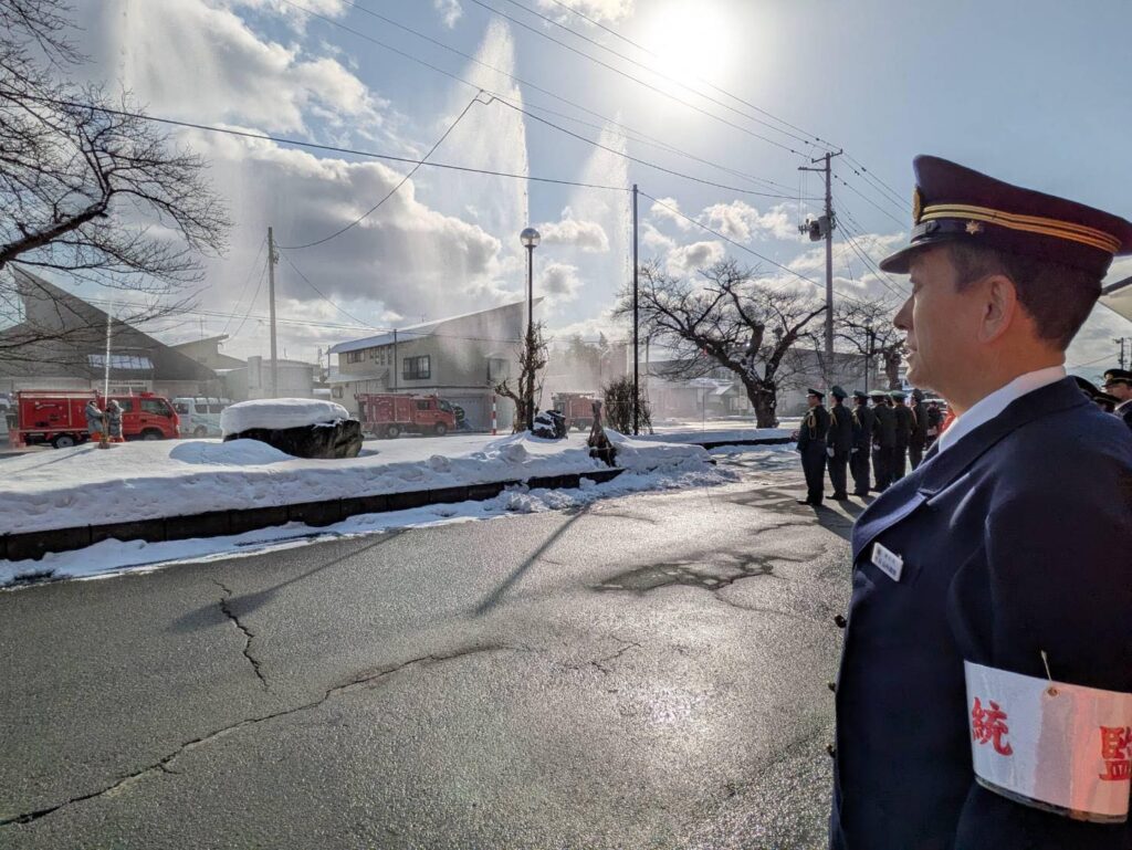 令和8年新庄市消防団出初式が開催されました。信夫団長指揮のもと観閲、分列行進、祝賀放水が行われました。市民の生命財産を守るべくご尽力いただいております。